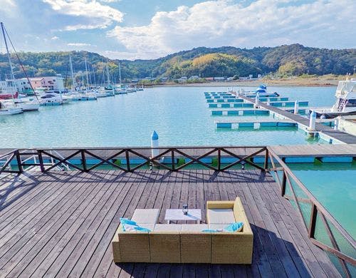 岡山県瀬戸内市のマリーナ内にある一日一組限定の貸別荘です。専用のひろびろデッキからは美しい夕日やマリーナの景色がご覧いただけます。BBQコンロ、焚き火台 無料貸出いたします。
