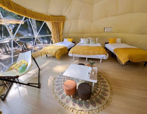 清流の里のドームテントで【 グランピング】×【信州牛&海鮮BBQ】!アメニティ充実も嬉しい!(魚釣り等は10月末迄)