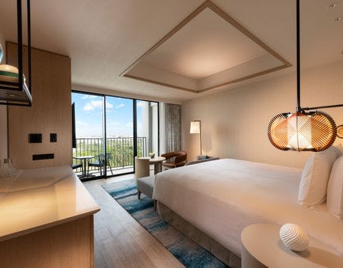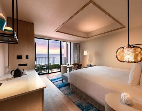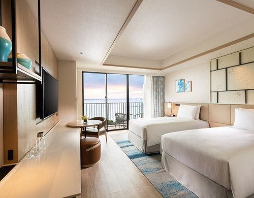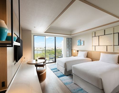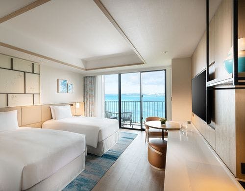全329の客室は、プライベートバルコニー付きで、オーシャンビューや伊良部大橋、緑と共に広がる街並みなど、部屋ごとに異なる景色を堪能できます。エグゼクティブルームやスイートルームの宿泊者は、専用ラウンジで朝食や軽食、飲み物を楽しむこともできます。どの部屋もカップルや家族旅行に最適です。