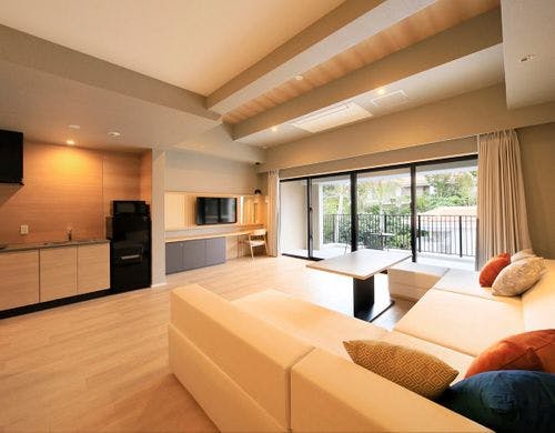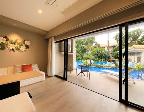 「Ocean Wing」は目の間にある海を一望できる客室が魅力で、1階には、プライベートプールを完備しています。「Forest Wing」は保安林に囲まれ、静かな空間が広がります。全室にキッチンやドラム式洗濯乾燥機を備え、バリアフリー対応の部屋も完備しています。インテリアも洗練され、長期滞在にも快適です。