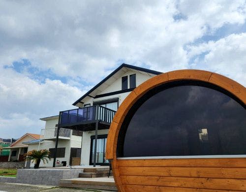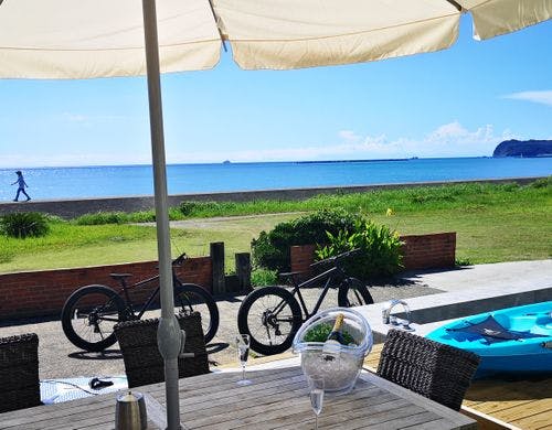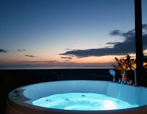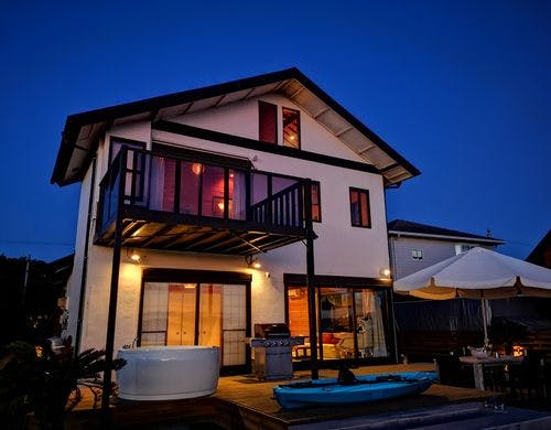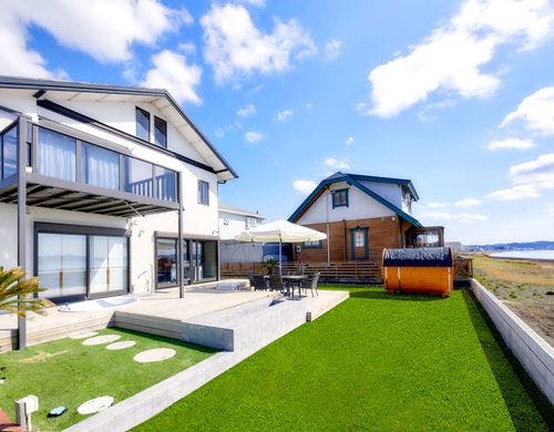 海まで徒歩30秒のオーシャンフロントヴィラ。富士山と館山湾を望む絶景オーシャンビューバレルサウナ・露天温水対応オーシャンビュージャグジー・オーシャンビュー足湯をお楽しみいただけます。