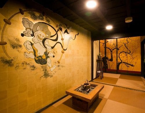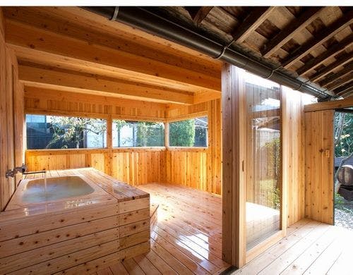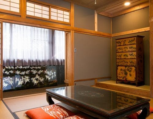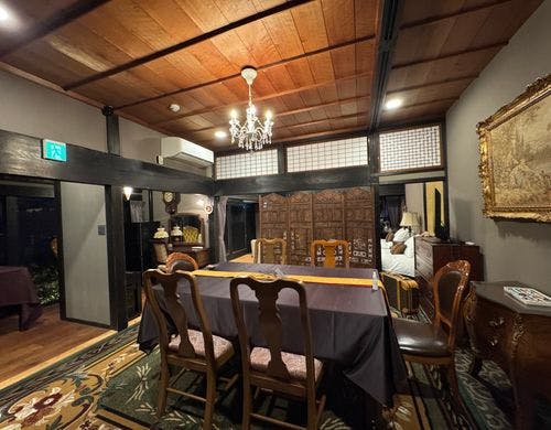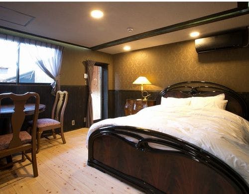 古き良き日本の情緒を感じる家具や、アンティークな西洋家具を合わせた、大正ロマンを彷彿とさせる和モダンな空間。庭園を眺める檜香る露天風呂で1日1組だけの贅沢時間。