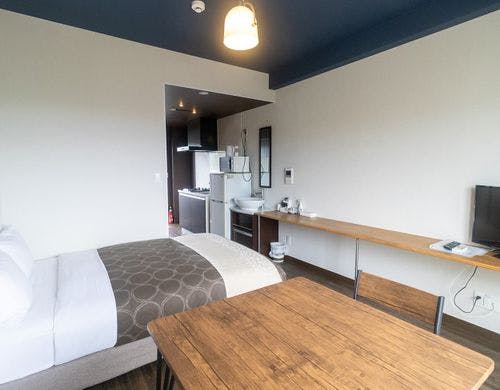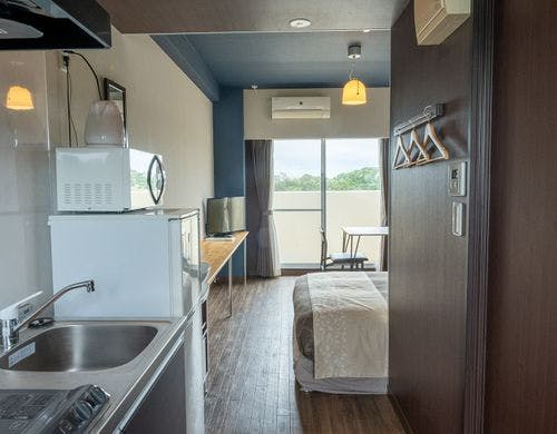名護市街地からほど近い閑静な住宅街、全室にミニキッチンと洗濯機&浴室乾燥機完備のアパートメントホテル