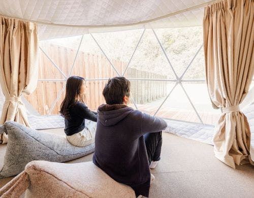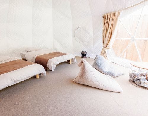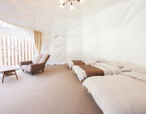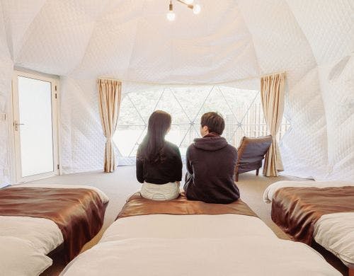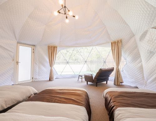 広島中心部から約40分の自然派リゾート★全室リバービューで夜景が綺麗なグランピング★BBQや樽サウナの後、川ダイブが人気