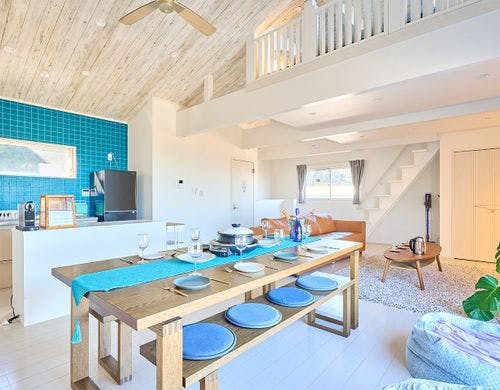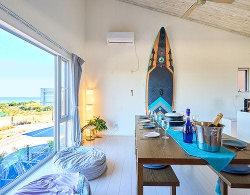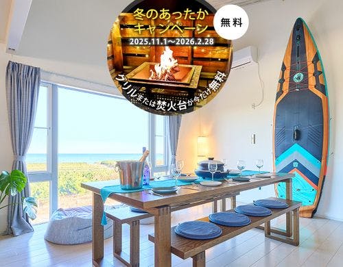 海が目の前!特大檜風呂と開放感ある高い天井、広いテラスでBBQしてリゾート感を満喫。最大14名様。