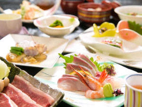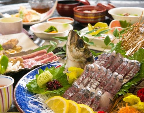 温泉街にあるこのホテルは活魚をメインとした魚料理が評判です。温泉は源泉かけ流しを存分に。