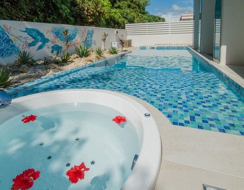 プール、ジャグジー付きリゾートヴィラ。子連れファミリーやグループ旅行に人気。美ら海水族館まで車で5分!