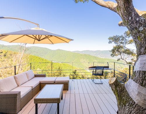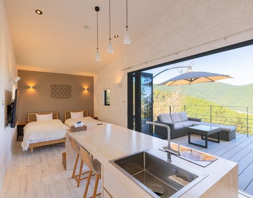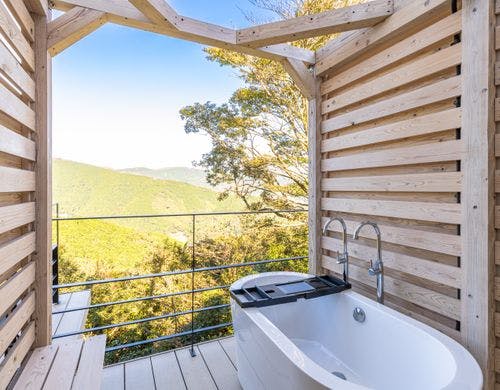 開放的な露天風呂もありもちろん温泉!雄大な景色を望むレンタルヴィラ。