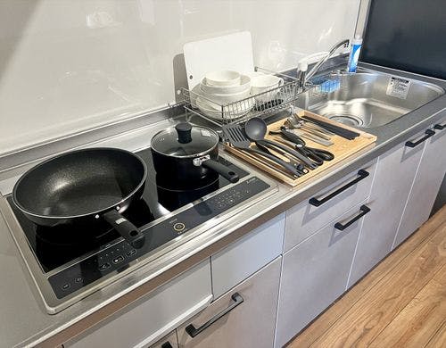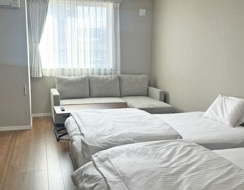 35.17の広いお部屋にリクライニングチェ・ソファーを全室完備、長期滞在者向けに調理器具・食器・キッチン・洗濯機付き。