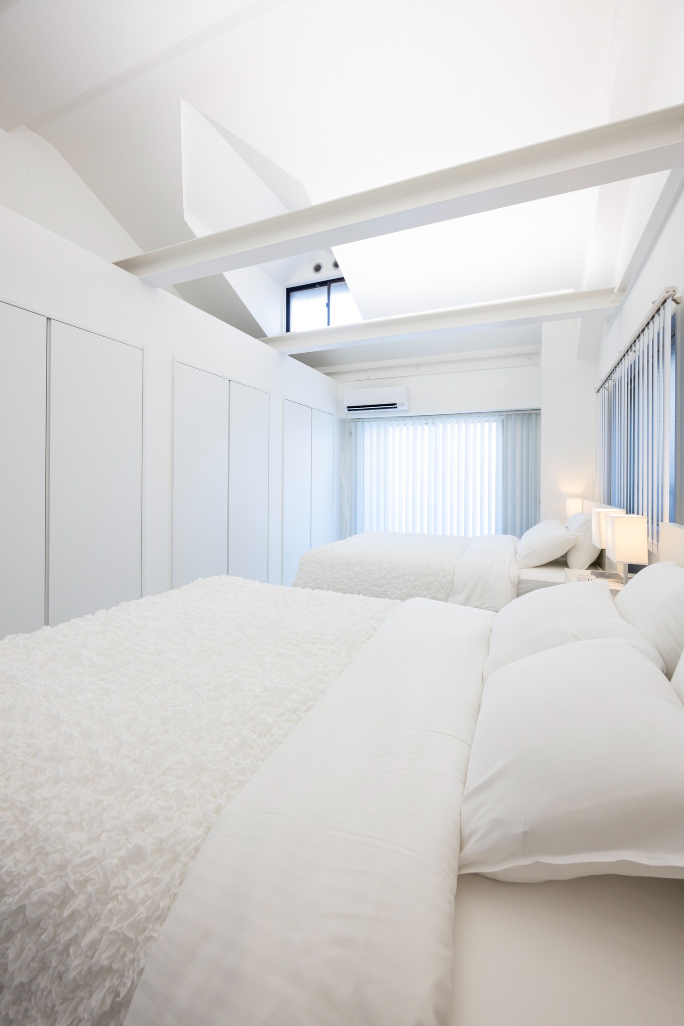 福岡市の賑やかな大名地区に位置するこのフラットは、静寂の中で癒しを提供する真っ白な空間です。