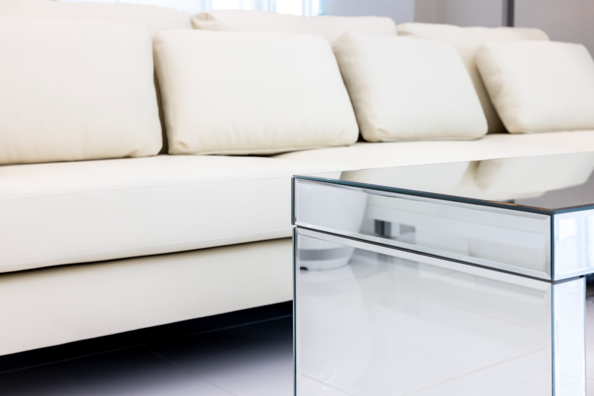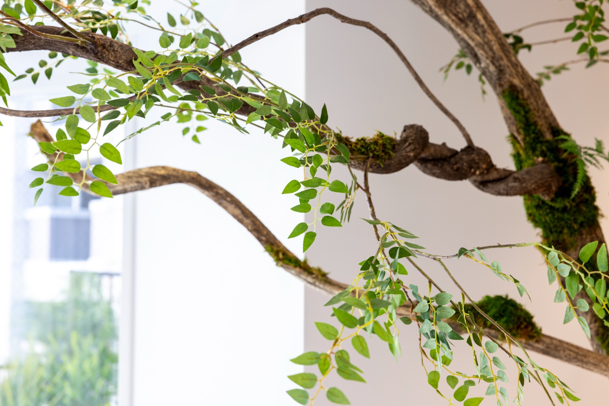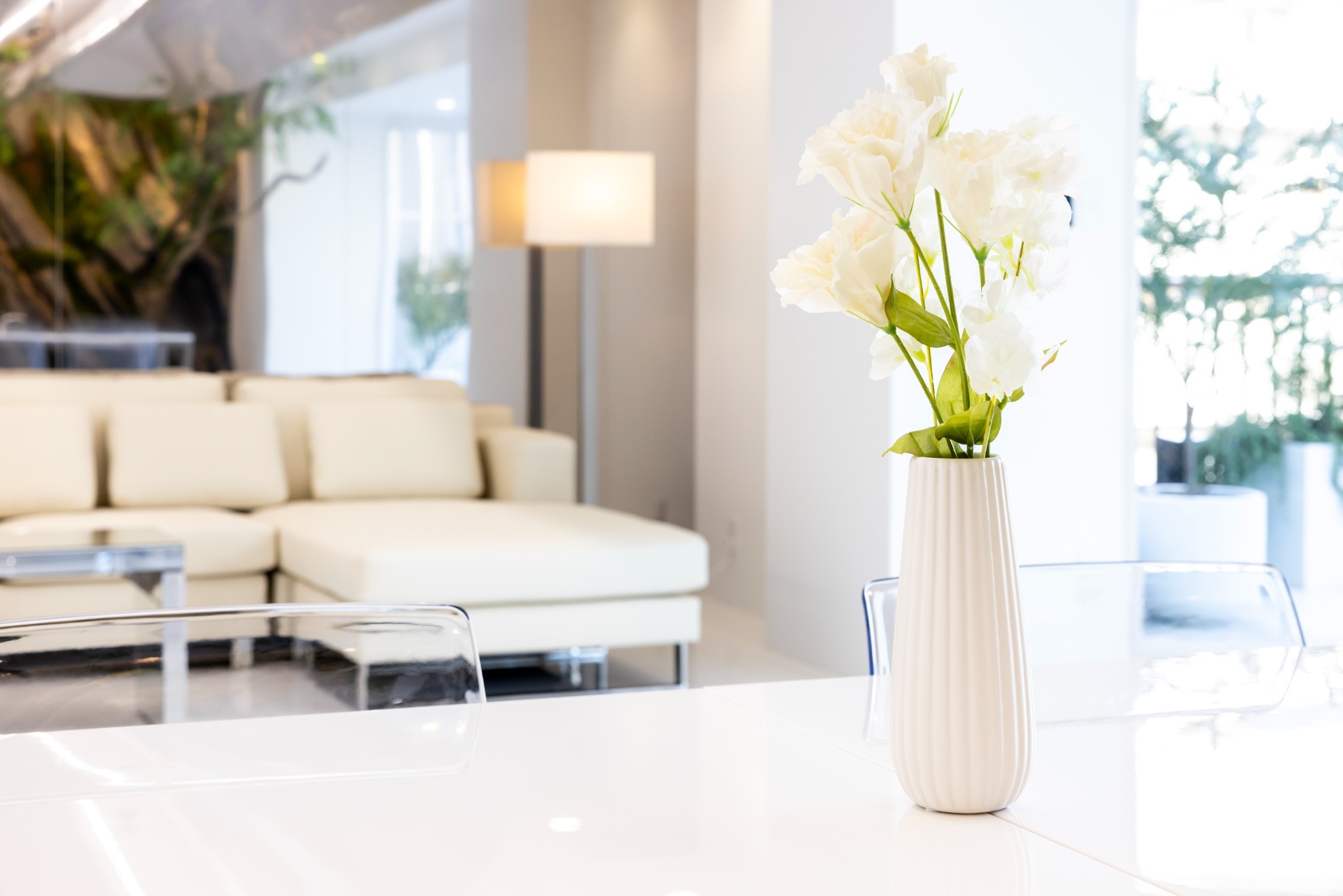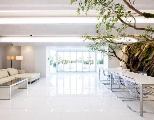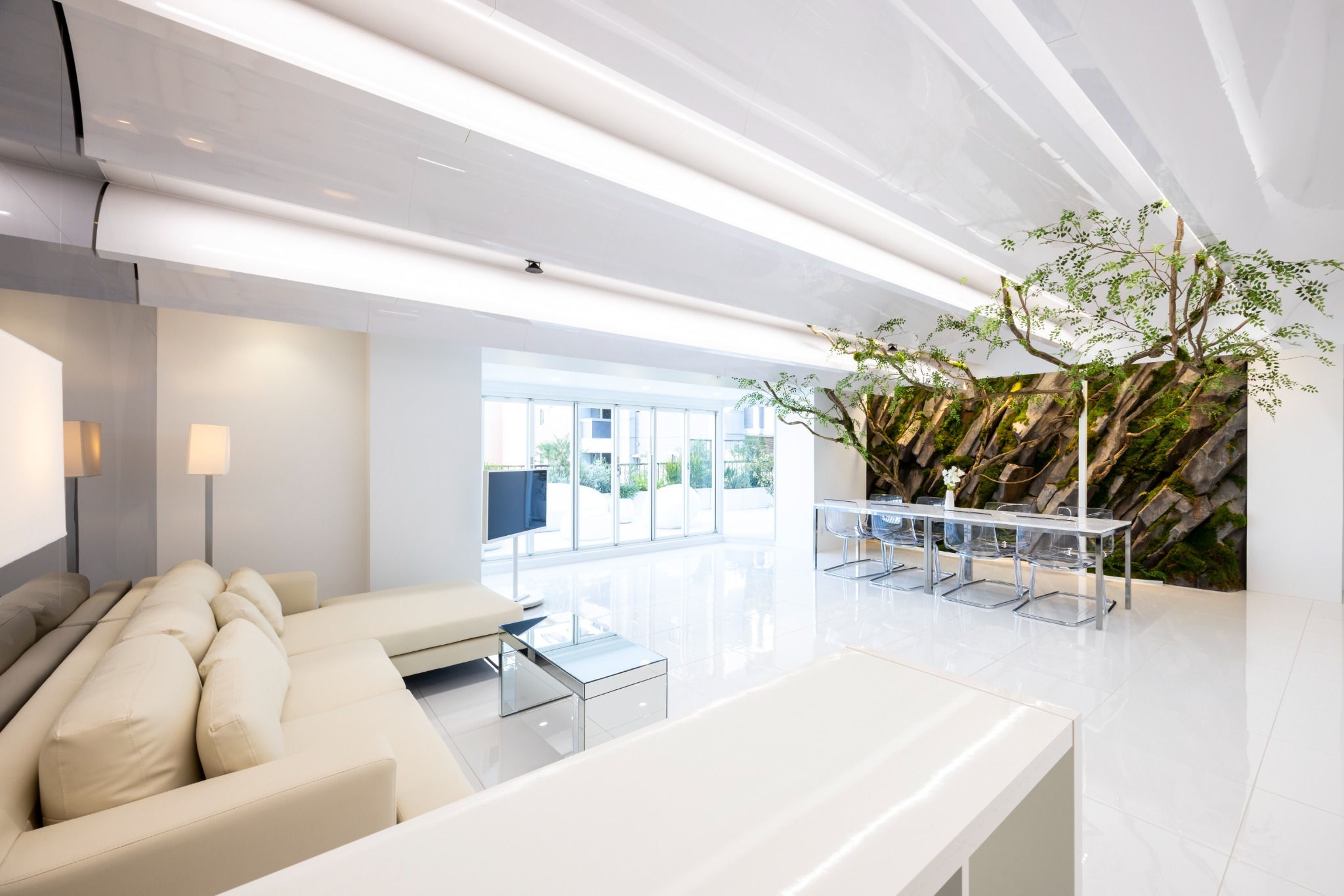 広々としたリビングエリアには、大きな窓から自然光がたっぷり差し込み、日中は明るく開放的な空間が広がります。壁面ひとつに巨大な植栽を配置。