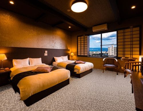 新館にクラブラウンジオープン!個室食、無料の貸切家族風呂もあり、避密の旅に最適。別府の街並みを眼下に望む【高台の宿】