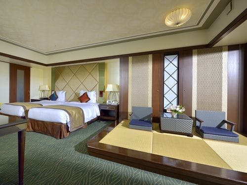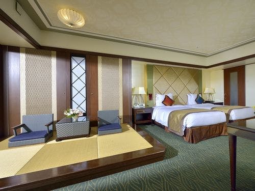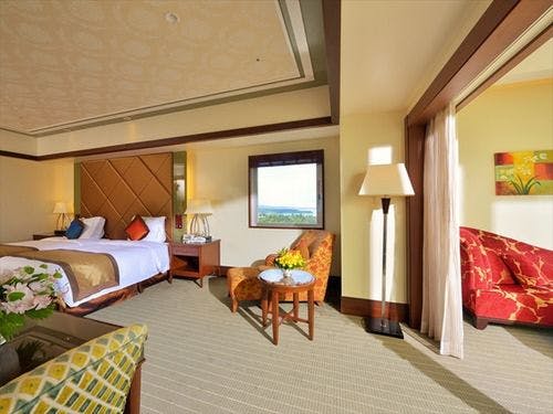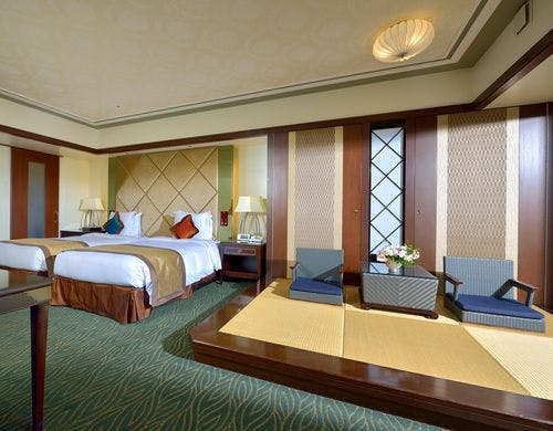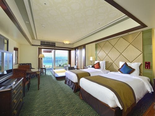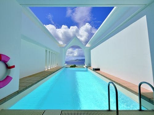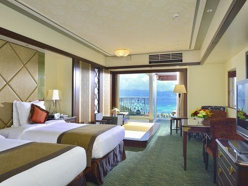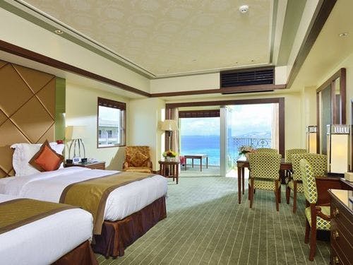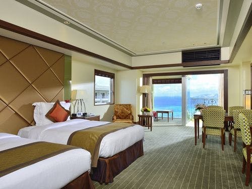客室はモダンで落ち着いたインテリアが施され、59平方メートルから103平方メートルのゆとりある広さが魅力です。専用プール付きのスイートや、沖縄の伝統工芸を感じる虹亀ルームなど、さまざまな趣向が凝らされた客室が用意されています。