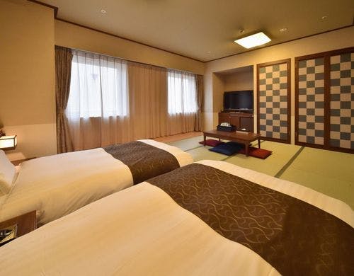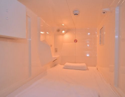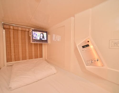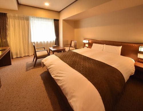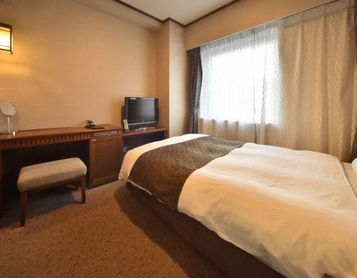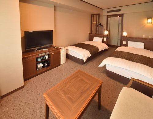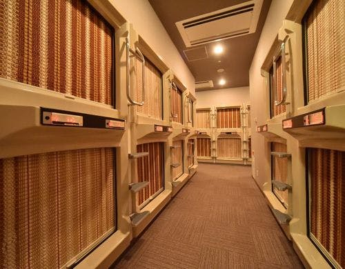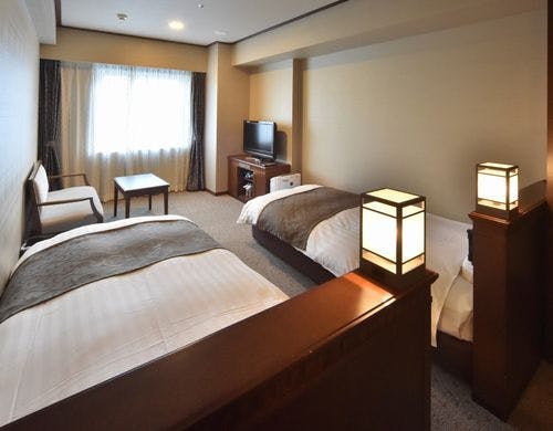 客室は大正ロマンをテーマにした温かみのあるレトロモダンなデザインです。ビジネスから家族旅行まで幅広く対応しており、ダブル、ツイン、和洋室などの多彩な部屋タイプが用意されています。Wi-Fi、温水洗浄トイレ、ドライヤーなどの客室設備が備わり、快適な滞在を提供します。また、男性限定でカプセルホテル式のグローバルキャビンも完備しています。