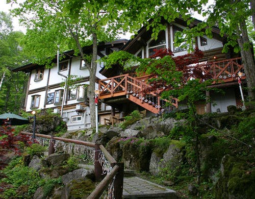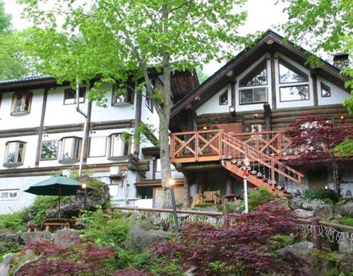 木の香りと温もりが優しいカナダ産の太い丸太のログハウス。信州牛を使用した料理と四季折々の景色が楽しめます。