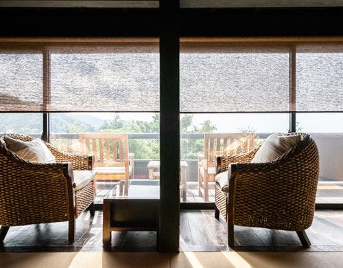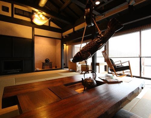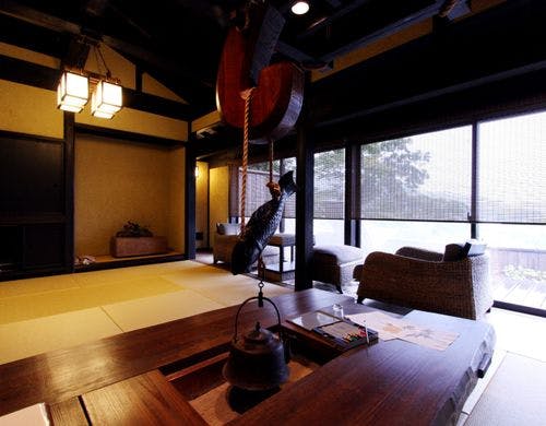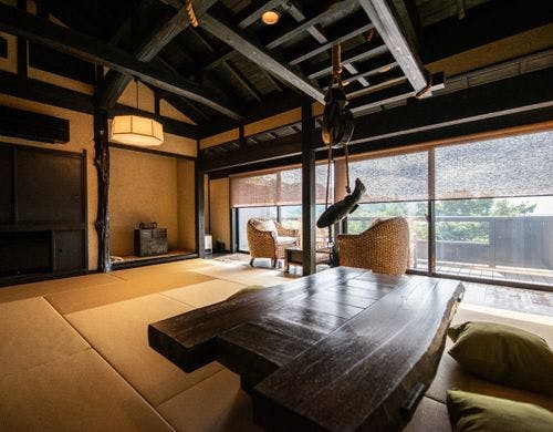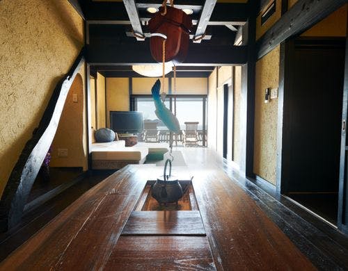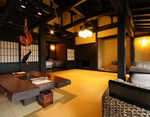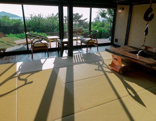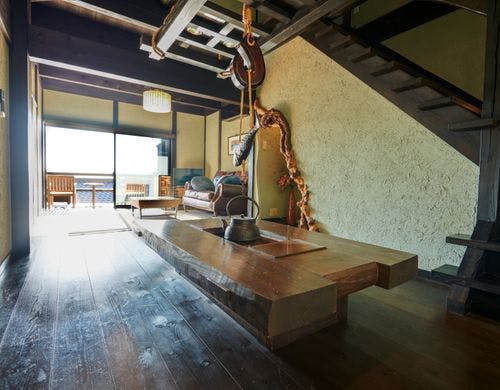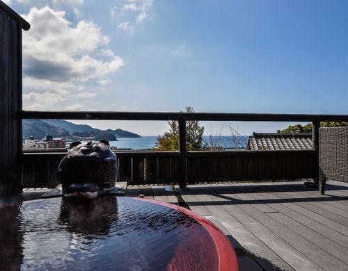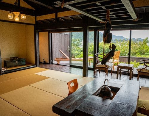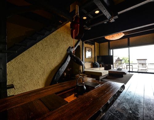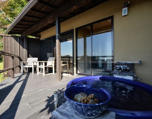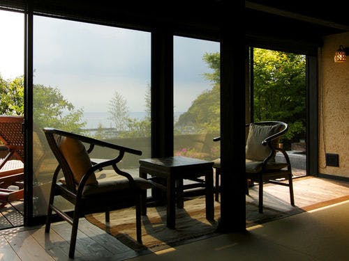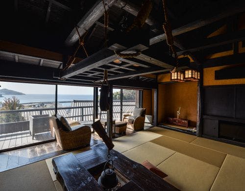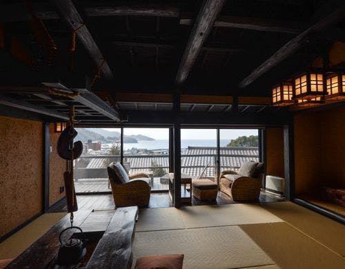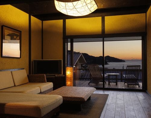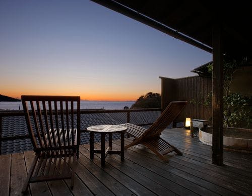 駿河湾と美しい夕日の絶景を一望する古民家風離れ。全8棟の源泉かけ流し露天風呂付客室で優雅なひとときを