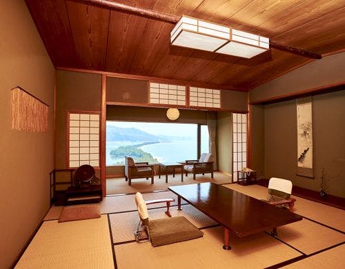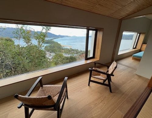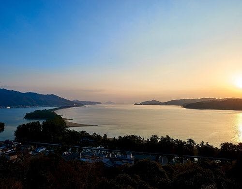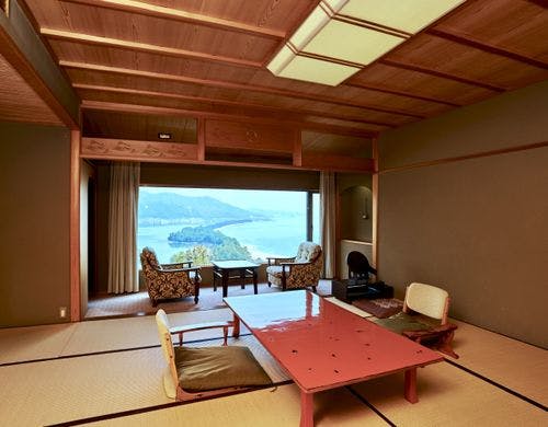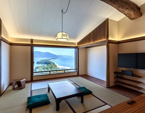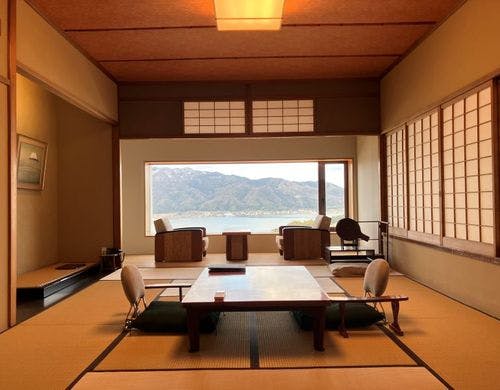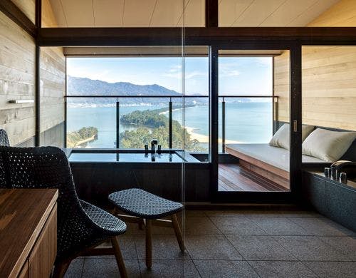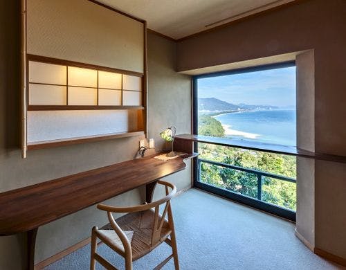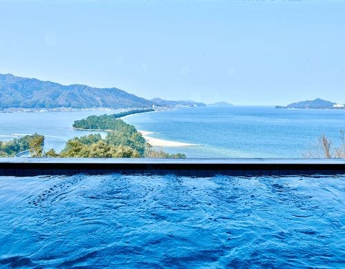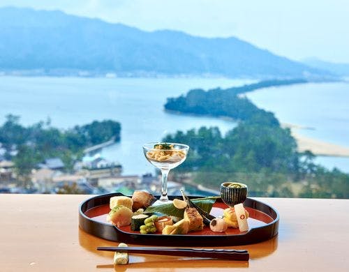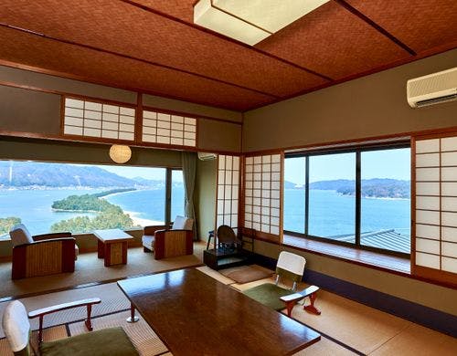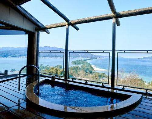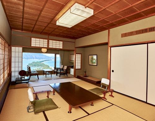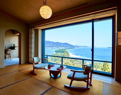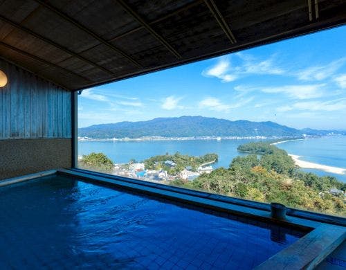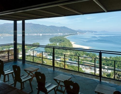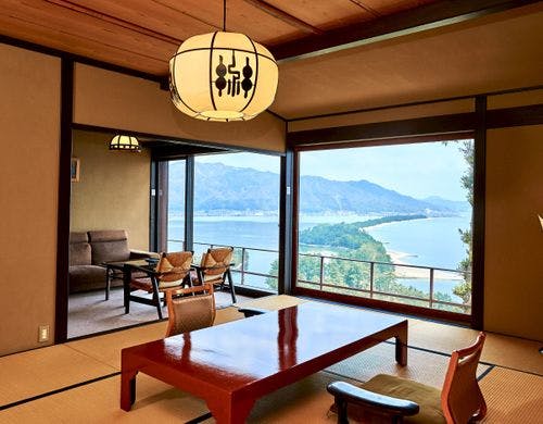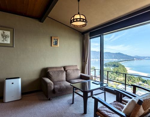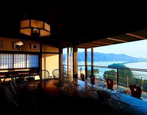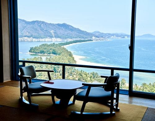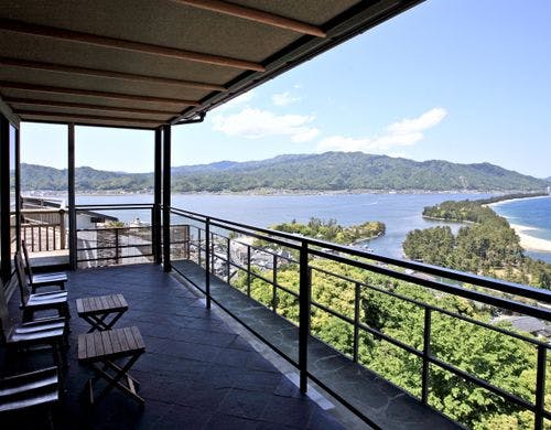 日本三景の一つ天橋立の絶景を一望する高台に位置し、緑の木立ちに囲まれた閑静な環境にあります。建物は心和む民芸調数寄屋造りの宿です。