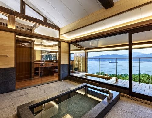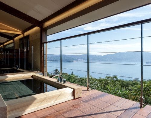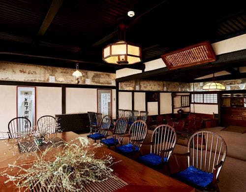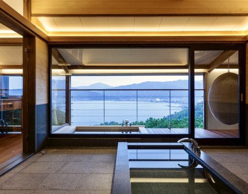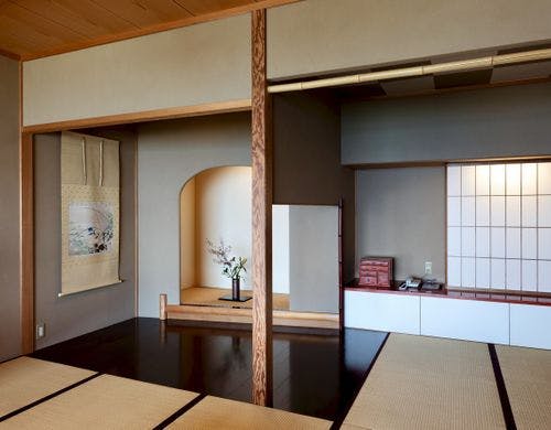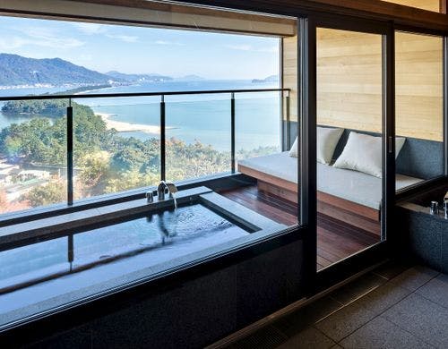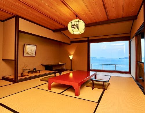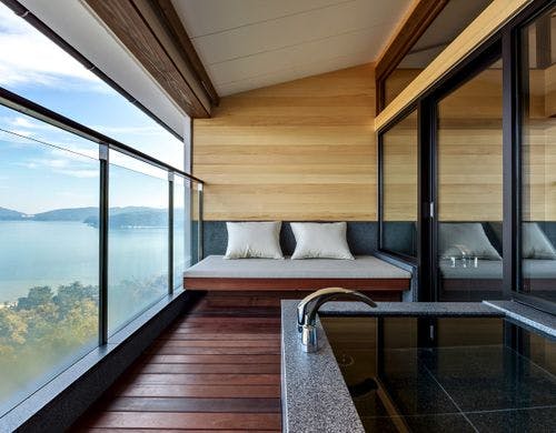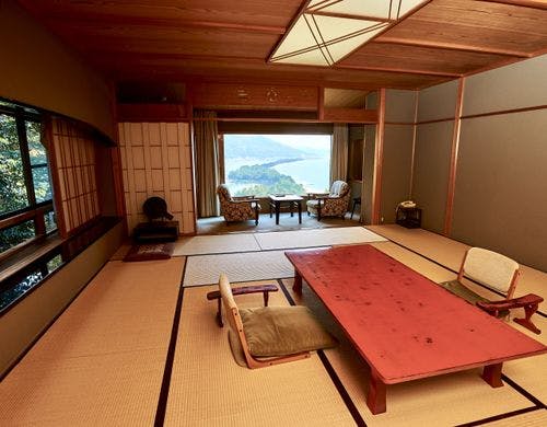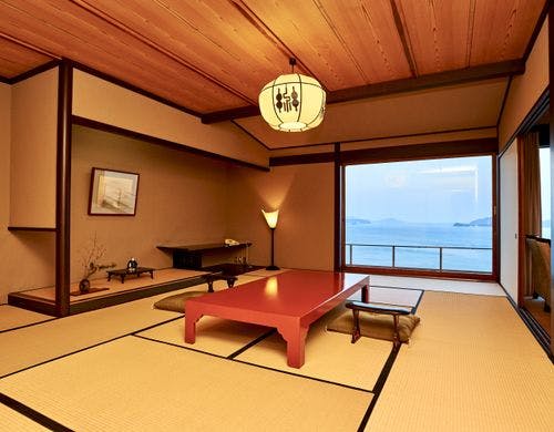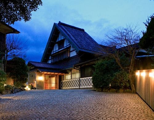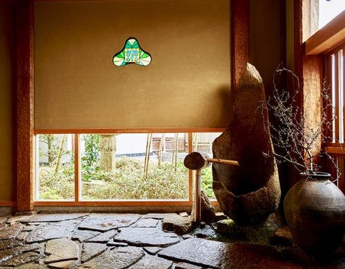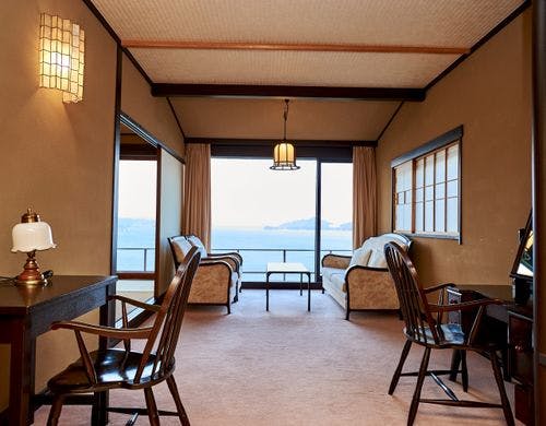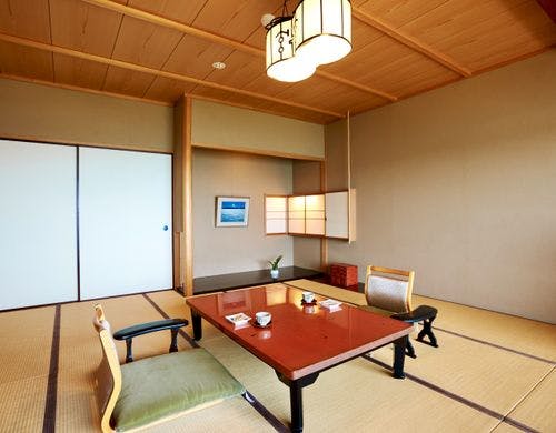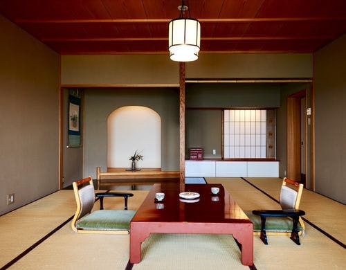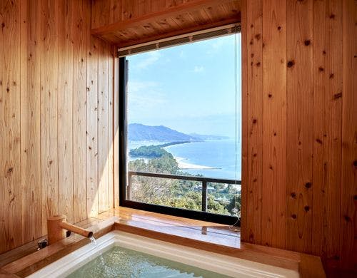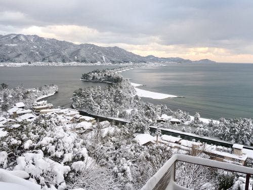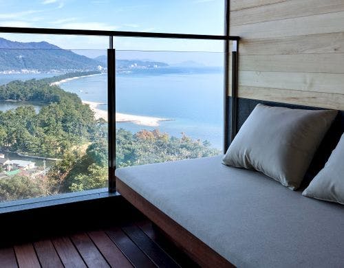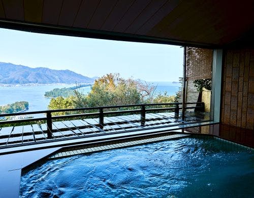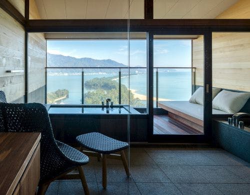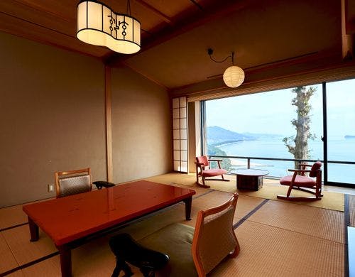 日本三景の一つ天橋立の絶景を一望する高台に位置し、緑の木立ちに囲まれた閑静な環境にあります。建物は心和む民芸調数寄屋造りの宿です。