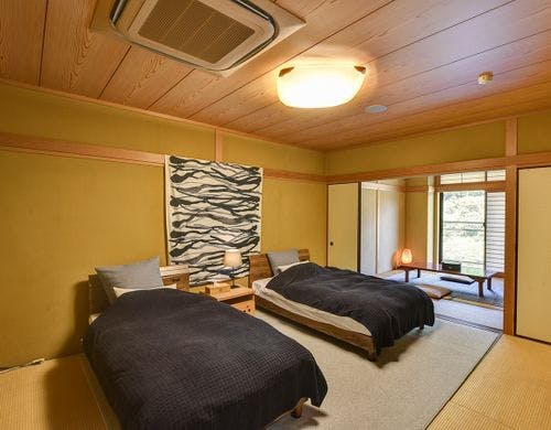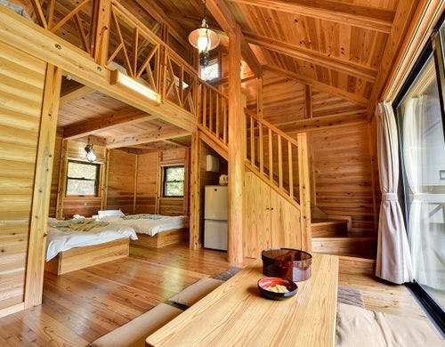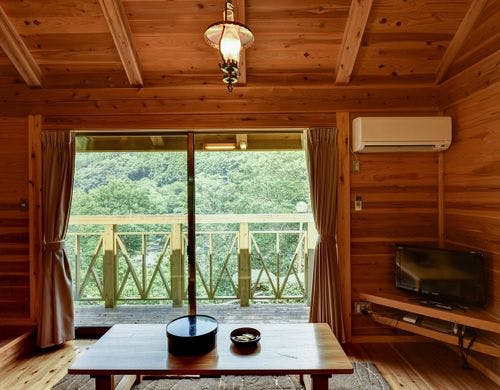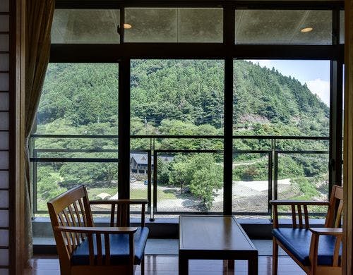 展望風呂付のお部屋が好評。ファミリーにおすすめの二階建てバンガローも。どの部屋からも眼下に勝浦川を見渡せます。