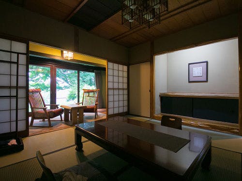 3万坪の敷地に意匠の違う離れが点在。100%源泉かけ流しの長湯温泉と地産地消にこだわった創作会席が好評。