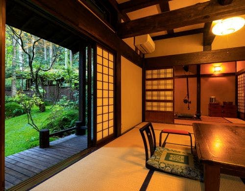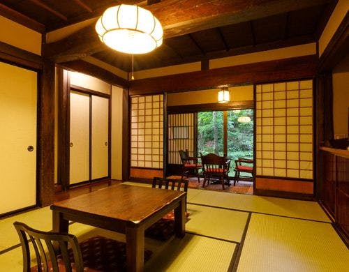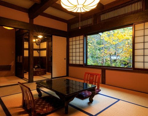 暖簾をくぐると手間暇をジックリ掛け組み上げた重厚な梁や柱は飛騨の匠の技物。山郷の豪農家と貸切露天風呂