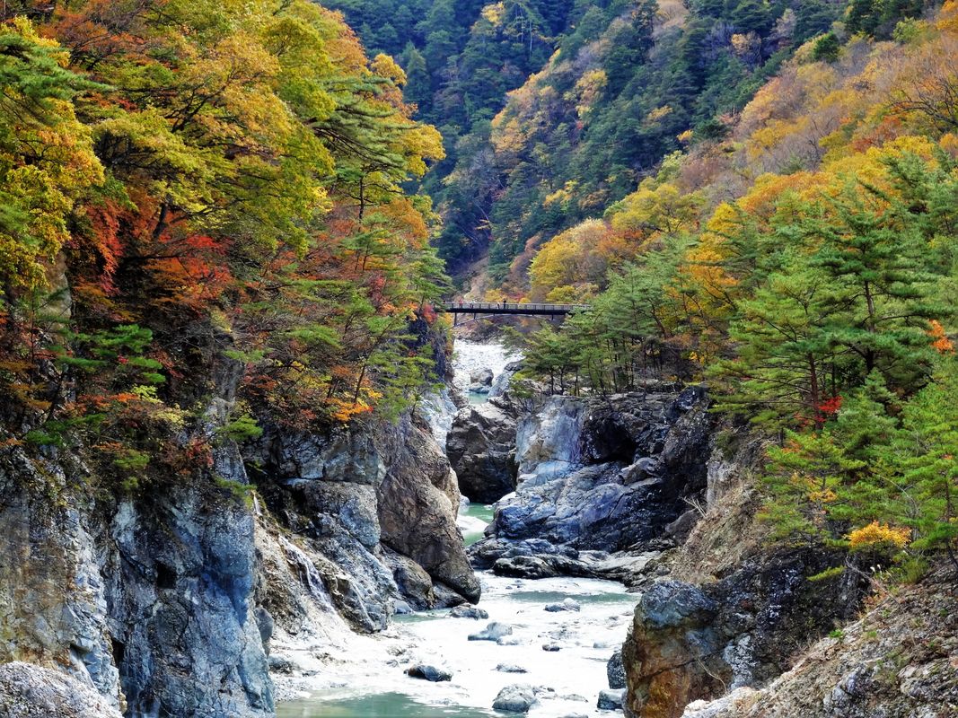 鬼怒楯岩大吊橋(きぬたていわおおつりばし)は、栃木県の鬼怒川温泉街と名勝「楯岩」を結ぶ歩行者専用のつり橋です。全長約140m、高さは約40mで、スリルとともに四季の美しい景観を楽しめます。特に紅葉の時期には、橋の上から眺められる鮮やかな風景が魅力。橋の上流にある楯岩を男性に、鬼怒川を女性にたとえ「縁結びの橋」とも呼ばれています。楯岩の頂上にある展望台は、温泉街を一望できる絶景スポット。遠くには鶏頂山(けいちょうざん)をはじめ高原山系の美しい山並みが広がります。周辺には他にも、縁結びと子宝のご利益があるといわれる楯岩鬼怒姫神社や、透明度が高く水底まで透き通った古釜の滝(ふるかまのたき)があり、橋から徒歩5~10分ほどなので併せて訪れるのがおすすめです。