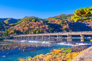 平安時代から愛され続けた景勝地・嵐山。そのシンボルともいえる存在が渡月橋です。桂川に架かる渡月橋は、元は平安初期、法輪寺への参拝のために造られた橋だとされています。そのため、当時は法輪寺橋と呼ばれていたのだとか。また、この辺りでは貴族たちが月を愛でながら舟遊びを楽しんだといわれています。渡月橋と呼ばれるようになったのは、鎌倉時代から。川のほとりに離宮を造営した亀山天皇が満月の夜に舟遊びをしていると、月が弧を描いて夜空を渡っていくその様と、弧を描いて川に架かる橋の形が似て見えたことから「くまなき月の渡るに似る」と詠み、そのことが渡月橋の名前の由来になったと伝わります。背後にある嵐山との調和は素晴らしく、季節を変えて訪れるとさまざまな表情を見せてくれます。春には山に咲く桜が彩りを添え、夏には深い緑と清らかな川の流れに一層涼を感じ、秋には真紅に染まる紅葉が水面に映り、冬に山全体に雪化粧を施したモノクロームな世界を見せてくれます。その四季折々の表情の美しさに、映画やドラマのロケ地として使われることもしばしば。こうした景色を写真に収めたいならおすすめなのは、渡月橋の北側。渡月橋と桂川、そして嵐山を一望できる絶好のフォトスポットですよ。また、毎年夏には桂川で鵜飼が行なわれ、屋形船からその様子を見ることもできます。平安時代に貴族が楽しんだといわれる舟遊び気分で、屋形船に乗ってみるのもおすすめですよ。渡月橋へは、京福電鉄(嵐電)嵐山駅から徒歩約3分です。