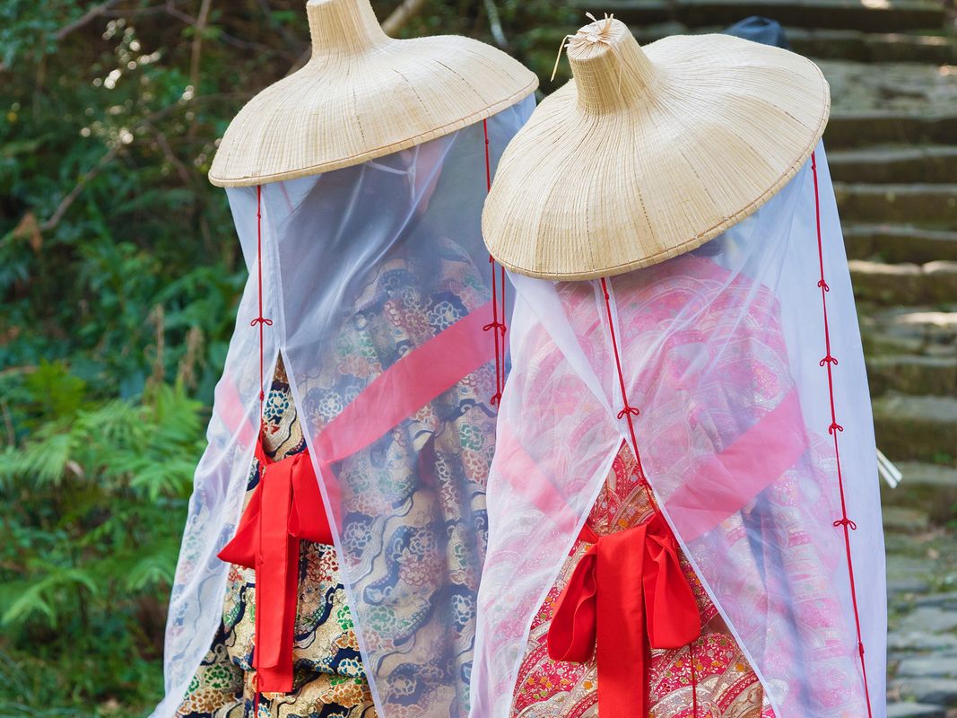 熊野那智大社(くまのなちたいしゃ)は、田辺市の熊野本宮大社、新宮市の熊野速玉大社と並ぶ熊野三山のひとつ。和歌山県北東部の那智山中腹に建ち、熊野那智大社へと続く大門坂は苔むした石段とうっそうとした老杉が熊野古道の雰囲気満点です。坂を上った先に現れる朱塗りの社殿は厳かな風格。明治初期に那智大社と分離された青岸渡寺(せいがんとじ)も隣接しており、今もなお双方を参拝する人が多く訪れます。主祭神はイザナミノミコトの別名である熊野夫須美大神(くまのふすみのおおかみ)。人の縁や諸々の願いを結ぶ宮として古来より崇められてきました。熊野の神様のお使いである八咫烏(やたがらす)が石に姿を変えたと言われる「烏石」や、垂直に133mという日本一の落差を誇る名瀑「那智の滝」など、熊野信仰を今に伝える見どころが満載です。