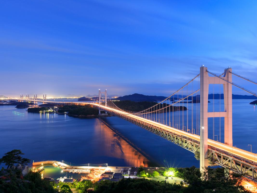 1988(昭和63)年に開通した、本州と四国を結ぶ6つの長大橋とそれらをつなぐ高架橋の総称。瀬戸内海をまたいで本州側は岡山県早島町(はやしまちょう)、四国側は香川県坂出市(さかいでし)をつないでおり、児島・坂出ルートとも呼ばれます。橋梁部の長さは9,368mで、上部に自動車、下部に電車が走る鉄道道路併用橋としては世界最大規模です。坂出市側のたもとには瀬戸大橋記念公園や回転展望台、瀬戸大橋タワーなど観光スポットが多数。土曜ほか特定日の夜はライトアップも施され、ロマンチックな雰囲気に包まれます。