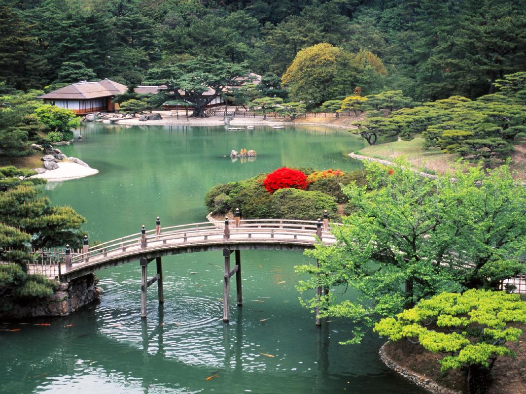 紫雲山の東麓に所在し、紫雲山を背景に、6つの池と13の築山を配し、400年近い歴史を有する大名庭園である。すぐれた地割と石組を有し、木石の雅趣に富んでいるとされている。面積は約75haで文化財庭園では、国内最大の広さである。文化財庭園としてのカエデ・ツツジ・約1000本の手入れマツなどに加え、都市公園としてのウメ・サクラ・ハス・ショウブ・ハギなどが創出する四季折々の景観は、「一歩一景」とされている。本園は、南庭と北庭で構成される。南庭は江戸時代初期の大名庭園の姿を今日に伝える。北庭は檜御殿が建ち鴨場であったが、大正時代初期に近代庭園のスタイルを取り入れた宮内省の市川之雄の設計で改修の後、一部を改変して今日に至る。本園の前身の「栗林荘」は、高松藩主の松平家11代の国もとの下屋敷として、228年間使用された。1745年(延享2年)第5代藩主頼恭が「名所60景」を撰名し、作庭が完成したとされる。「名所60景」は、南庭に46景と北庭に4景の、50景が現存する。