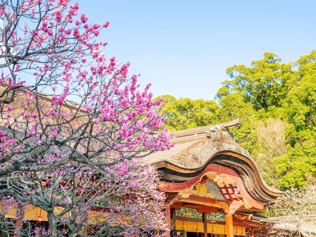 防府天満宮(ほうふてんまんぐう)は山口県防府市にある神社で、日本で最初に創建された天神さまといわれています。祭神として菅原道真公が祭られ、本殿をはじめとする社殿や、眺望のよい春風楼は国の登録有形文化財です。境内には約16種類1,100本の梅の木があり、2~3月の開花時期に合わせて梅まつりを開催。また例年11月の第4土曜日には「裸坊祭」とも呼ばれる勇壮な御神幸祭(ごじんこうさい)が行われ、多くの参拝客でにぎわいます。そのほか境内の歴史館前には「LOVE神社」という石碑があり、ここで写真を撮ると幸せになれるとも話題に。LOVE神社のお守りは防府天満宮社務所で授かることができます。