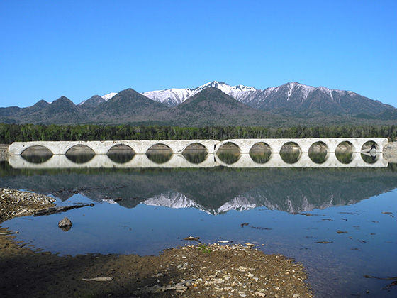 「タウシュベツ川橋梁」が有名な士幌線廃線跡巡り。その他にも各所に当時のアーチ橋や駅舎跡が残り、その経年から自然とマッチしている風景が多くの写真家から愛されています。
