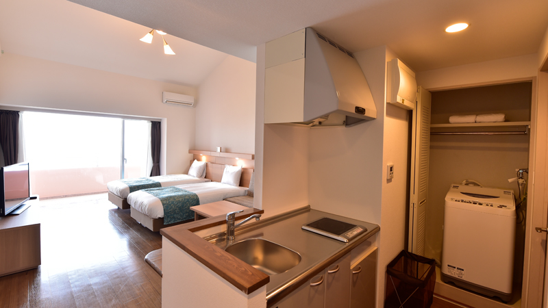 ウェルネスヴィラ ブリッサは、全ての客室にキッチンと洗濯乾燥機を備えた長期滞在型のホテルです。食器や調理器具まで揃っているから安心。客室は全タイプ40平方メートル以上のゆったりとしたスペースで、全室オーシャンビュー。客室のバルコニーからは美しい珊瑚礁を一望できます。