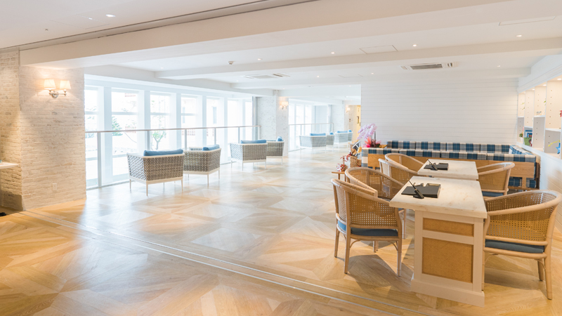 白と青を基調とした明るい陽射しが差し込むロビー。水平線が広がっています