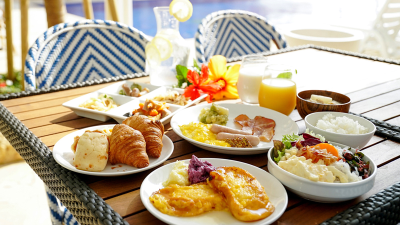 旬の食材を使った和洋琉の朝食ビュッフェ。天気のいい日はプールサイドでゆっくり楽しんで