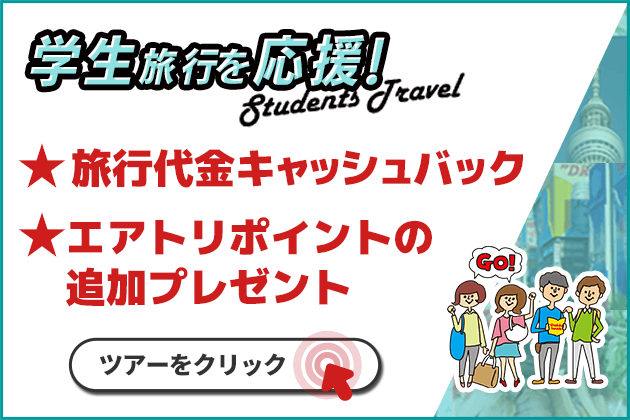 対象商品:ツアータイトルに「★学生旅行応援キャンペーン対象プラン★」と記載のあるツアー