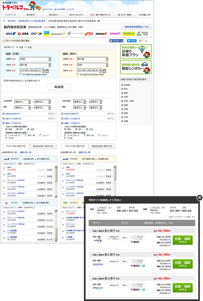 skyticketはこれまでトラベルコちゃん 海外航空券比較サービスと連携し、商品を掲載してきましたが、2016年10月27日、新たにトラベルコちゃん 国内航空券比較サービスでも連携を開始しました。skyticketの国内航空券予約では、ANA、JALはもちろん、手頃な価格で人気の高いLCC(格安航空会社)の航空券も取り扱っており、今回の連携により、トラベルコちゃんで国内航空券を検索・比較した際の予約先サイトの選択肢が増えて、ユーザの利便性がこれまでよりさらに向上しました。