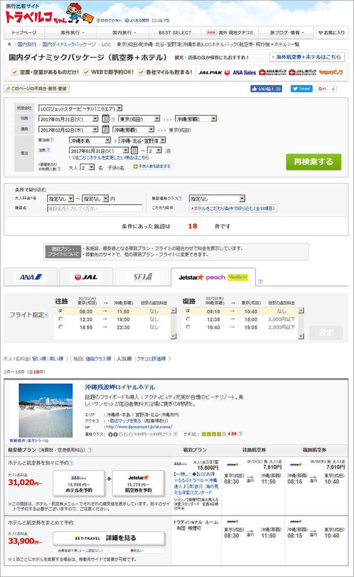 トラベルコちゃん 国内ダイナミックパッケージ(航空券+ホテル)比較は、複数の旅行会社・予約サイトが取り扱う国内ダイナミックパッケージ(航空券+ホテル)商品を一括で検索・比較することのできる国内で唯一のサービスです。2016年11月24日、新たに旅行予約サイト Tトラベルとの連携を開始し、Tトラベルの取り扱うジェットスターのダイナミックパッケージ商品をトラベルコちゃんで検索・比較することができるようになりました。これにより、トラベルコちゃん 国内ダイナミックパッケージ(航空券+ホテル)比較サービスの検索・比較対象サイト数は、合計7サイトとなりました。