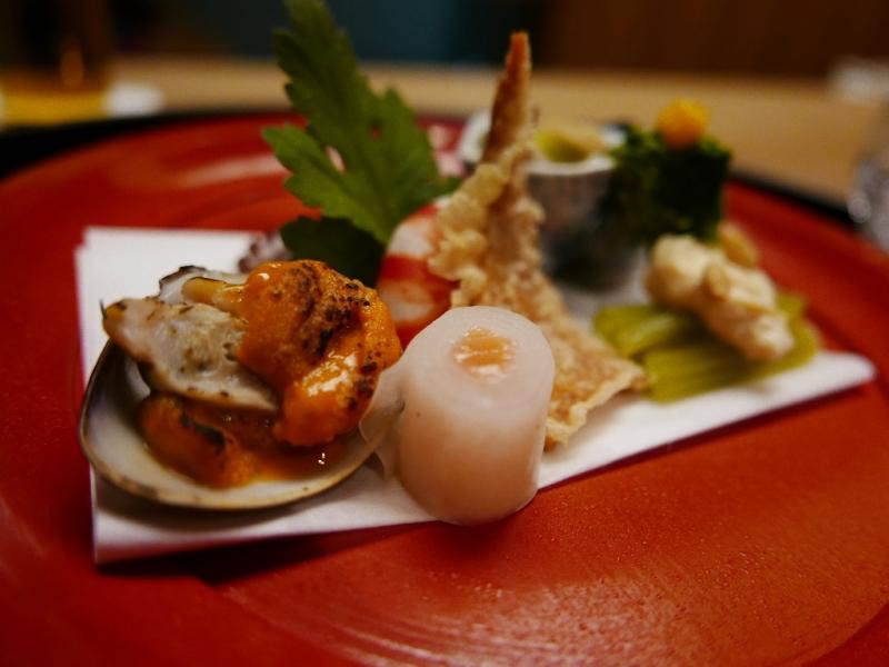 ミル貝、雲丹焼き、花山葵、菜の花、ふき白和え、イイダコ、才巻海老、ばちこの天ぷら、 桜マスの砧巻き