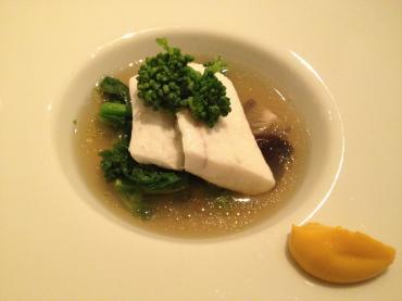 脂ののった平目を昆布のブイヨンで火入れしてハマグリのジュレが合わさっています。
