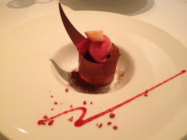 薄い生チョコレートの飾りと中のチョコレートの味わいに苺の酸味で何とも言えない口当たりです。