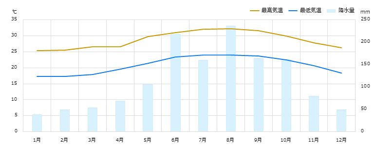 年中温暖であるが、昼は暑くても朝晩には冷えこむ時があるので、はおり物を用意すると便利。日中は日本の夏同様薄着で過ごし易いが、高級レストランなどではTシャツや短ズボンなどの軽装では断られる場合もあるので注意。1月 2月 3月 4月 5月 6月 7月 8月 9月 10月 11月 12月 旅行ベスト