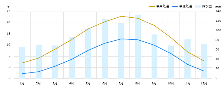冬は曇りがちだが、降水量は少ない。6~8月に比較的雨が多く、7月は30℃を超えることもあるが、湿気がないので過ごしやすい。