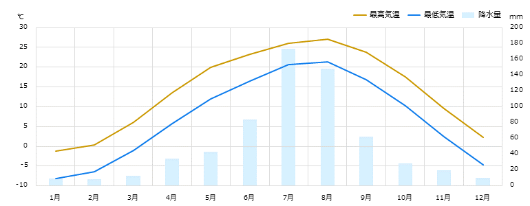 5月頃から9月頃にかけての夏場は、大連は気温が高くなり、日中は半袖のTシャツなどが過ごしやすい。しかしながら、朝晩の冷え込みや、海風で肌寒く感じることもあるので上から羽織るもの等を用意して、温度の変化に対応できるようにしたい。12月頃から3月頃は気温が低くなり、平均最低気温も0度を下回るので、外出の際はしっかりとした防寒着が必要である。1月 2月 3月 4月 5月 6月 7月 8月 9月 10月 11月 12月 旅行ベスト