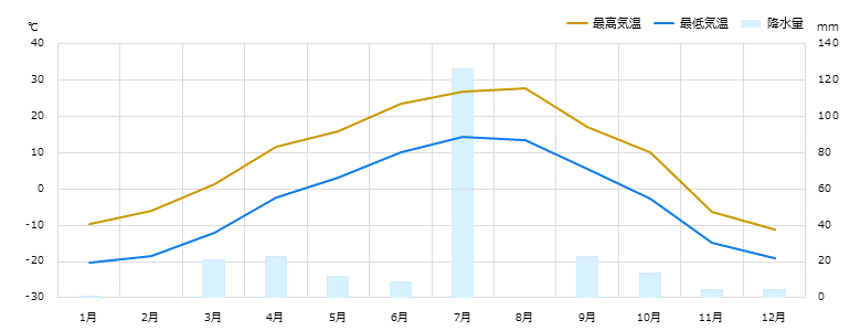 気候区部分は大陸性ステップ気候に属し、高緯度かつ高地に位置するため1年を通して乾燥し寒暖差が大きい。年平均気温は-1度以下、年間降水量も東京の4分の1以下でそのほとんどが夏季に集中する。世界で最も寒い首都としても有名で、冬は-20度から-40度近くまで冷え込む。夏は日中は30度近くまで気温が上昇するが、朝晩には10度前後まで落ち込むことが多い。服装