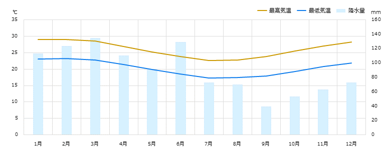 年間を通して温暖で、爽やかな気候。一年中オンシーズンといえる。服装