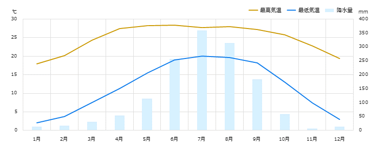 春から秋は日本のと同様の服装で臨めば問題ない。冬は1日の寒暖差が大きく日中は半袖でも過ごせる日が多いが朝晩は冷え込むので厚めの上着が必要になる。1月 2月 3月 4月 5月 6月 7月 8月 9月 10月 11月 12月 旅行ベスト