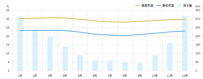 4月~11月にかけては比較的涼しい乾期で、平均気温21~27℃と過ごしやすいが、朝夕はやや涼しくなるので薄手のセーターかトレーナーなど用意しておくと安心。12月中旬からは3月は高温多湿の雨期で気温は27~30℃を超える日が多いので、夏の服装でよい。1月 2月 3月 4月 5月 6月 7月 8月 9月 10月 11月 12月 旅行ベスト