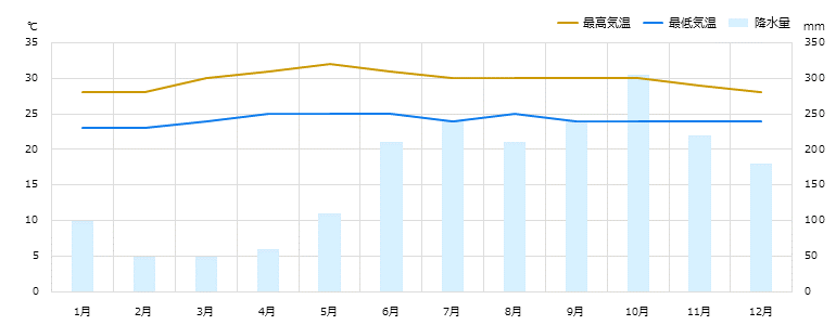 熱帯モンスーン気候に属しており、年間を通して25~30度前後の常夏の気候が続く。季節は12~5月の乾季と6~11月の雨季に二分されるが、雨季でも1日中降り続けることも少ない。乾季の終盤は気温が35度を超える日も多くかなり暑い。服装