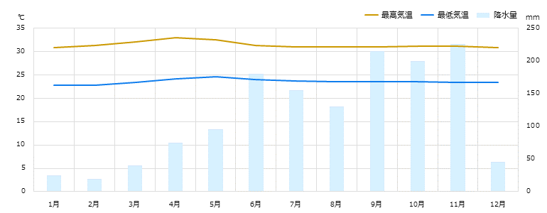 1年通して蒸し暑いので通気性の高い服装が好ましい。室内は冷房がかなり強く、外部との温度差で体調を崩しやすい。カーディガンやパーカーなど羽織るものを1枚携帯しておこう。スコール対策として折り畳み傘やタオルも忘れずに。1月 2月 3月 4月 5月 6月 7月 8月 9月 10月 11月 12月 旅行ベスト